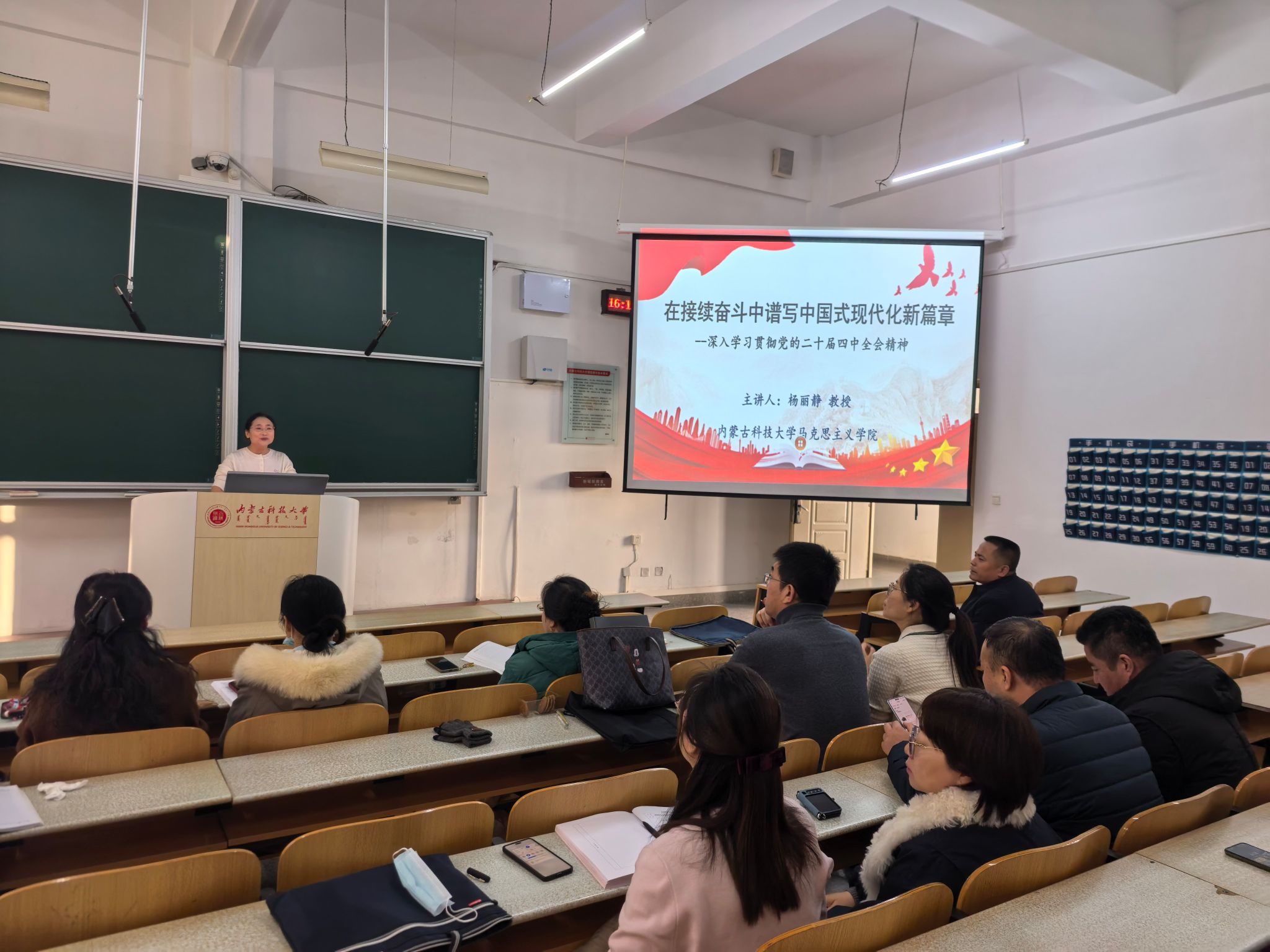 为深入学习宣传贯彻党的二十届四中全会精神,切实把思想和行动统一到党中央决策部署和学校工作要求上来,12月4日下午,后勤与基本建设处党总支在春晖学堂F207举办党的二十届四中全会精神宣讲会。马克思主义学院杨丽静教授应邀作专题报告,党总支全体党员、入党积极分子及科级干部参加学习。